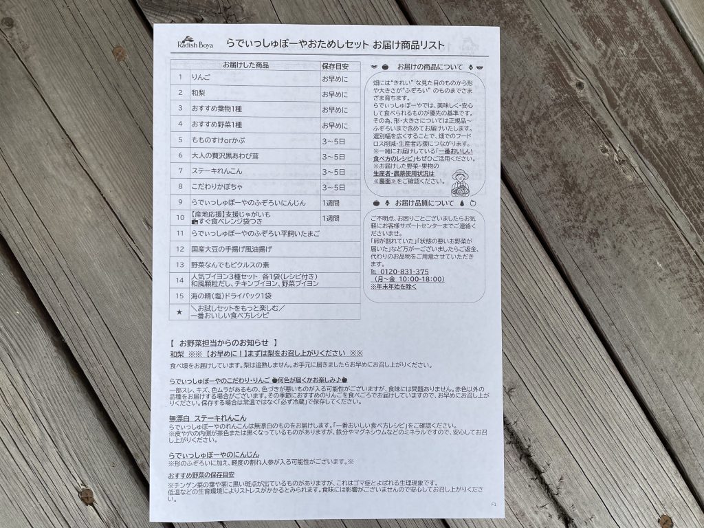 各食材の保存目安が書かれた紙も入っていました。どれを優先して食べたらよいかを判断しやすく、結果的に全部を美味しくいただけました。
