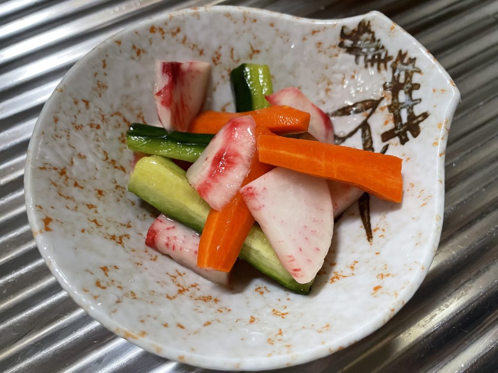 付属のピクルス液に漬けた、赤カブ(もものすけ)と人参(と、スーパーで買ったきゅうり)。