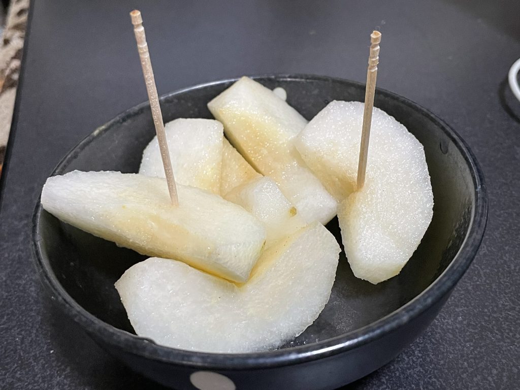 「なにこれ、りんご?」と思うくらい甘く、いつものれんこんとは別物です。歯応えもしゃきしゃきしていて、日本酒によく合うおつまみになりました。