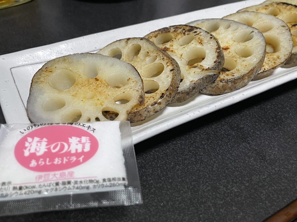「海の精」という塩も付いています。これは塩田で作られた塩で、我が家ではお馴染みの塩なのですが、れんこんの甘みを引き立てる、素晴らしいエッセンスになっていました。
