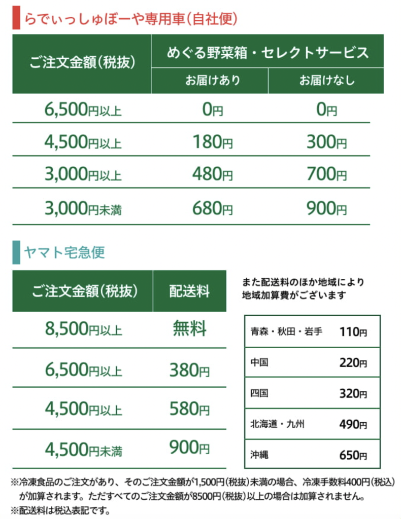 下の画像は公式サイトに掲載されている配送料です。ぜひ参考にしてください。