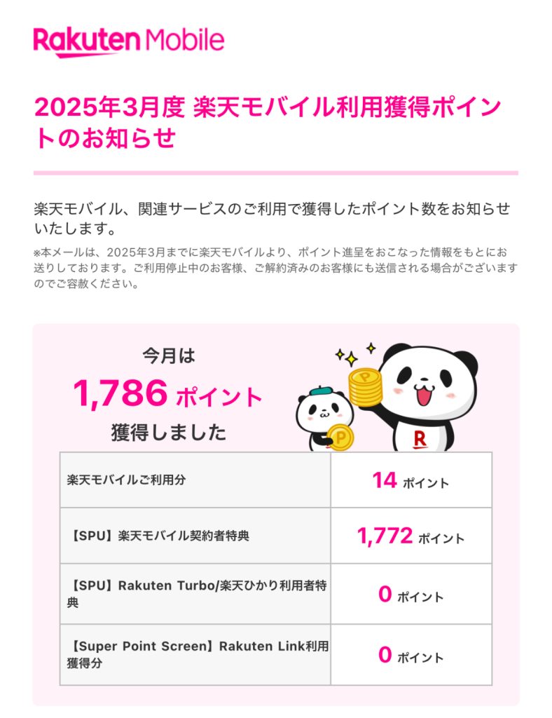 上の画像は、2025年3月度のわたしの楽天モバイル利用獲得ポイントです。楽天モバイル契約者特典で1,772ポイントが還元されています。
