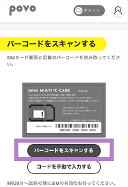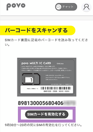 次に「バーコードをスキャンする」ボタンをタップします。SIMカードの台紙裏にあるバーコードをスキャンしたら、最後に「SIMカードを有効化する」ボタンをタップしてください。