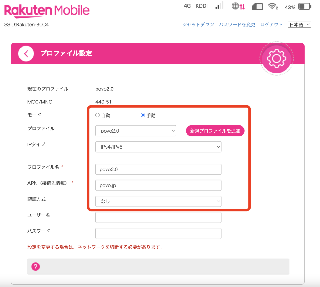 楽天モバイルのポケット型WiFiをpovo 2.0で利用する手順